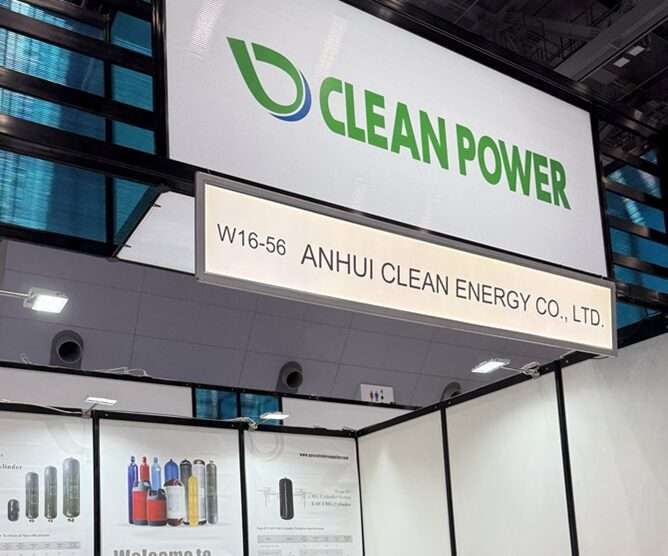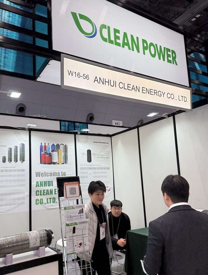 今回取材したのは、中国安徽省を拠点とする Anhui Clean Energy Co., Ltd.(ブランド名:CLEAN POWER)です。同社は産業用ガスボンベやCNGタンクを主力製品とするメーカーで、展示ブースでは各種高圧ガス容器が紹介されていました。