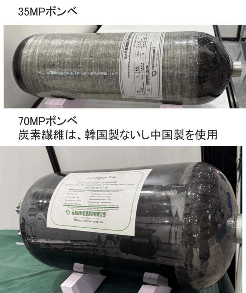 展示品の中心は、35MPaおよび70MPaクラスの高圧ボンベです。外観からは炭素繊維を用いた複合容器であることが確認でき、炭素繊維については韓国製もしくは中国製材料を使用しているとの説明がありました。用途としては、水素用途を意識した仕様であるものの、展示品はあくまで「For Display Only」と位置づけられていました。