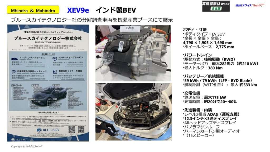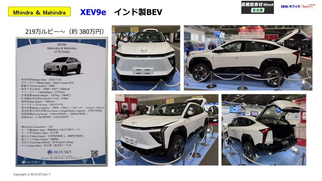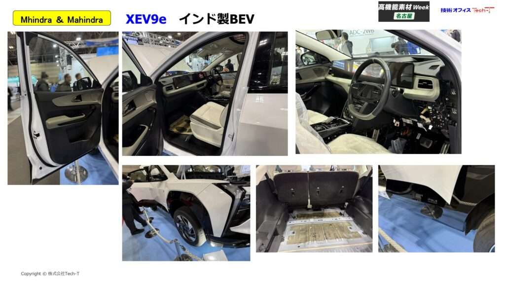 材料単体の展示に加え、インド・マヒンドラ性の電気自動車が分解展示されていました。