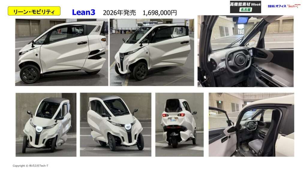また、次世代小型モビリティLean3(ミニカー いわゆる原付三三。一人乗りで最高時速60km)の体験試乗ができました。話題のクルマの実車を始めてみて、さらには運転もできました。走行安定性、操縦性の高さが実際に体感でき、設計思想を感じることができました。外板は軽量化のために樹脂となっています。機会を得て、調査したいと考えています。