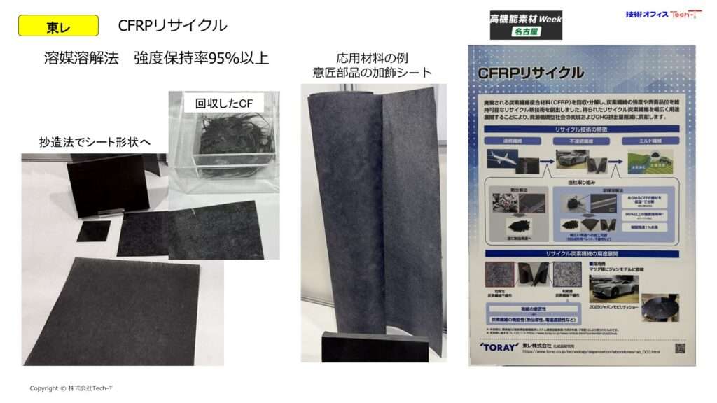 CFRPリサイクル分野では、廃棄される炭素繊維複合材料を従来の熱部内報よりも低温で分解し、炭素繊維の強度を95%以上保持したまま再資源化する溶媒溶解法が紹介されました。回収された炭素繊維は、不織布や射出成形用ペレットなどへ加工可能であり、資源循環とGHG排出量削減の両立を実現する技術として注目されます。