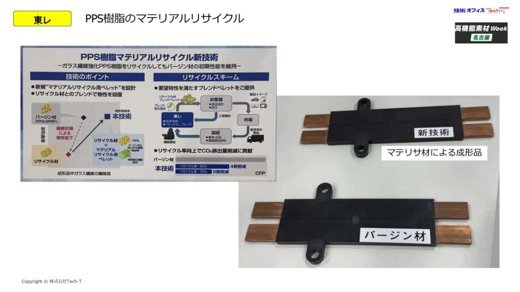 PPS樹脂に関しては、ガラス繊維強化PPSを対象としたマテリアルリサイクル技術が展示されました。従来は繊維折損や物性低下が課題とされてきましたが、新技術ではリサイクル材とバージン材を最適にブレンドすることで、初期性能を維持した成形品を実現しています。自動車部品をはじめとする高信頼性用途において、リサイクル材料の適用範囲を広げる重要な技術といえるでしょう。