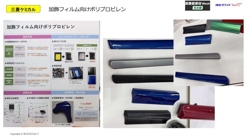 モノマテリアル化を狙ったPPフィルムの提案です。本展示会では、加飾フィルム向けPP材料が紹介され、従来使用されてきたPMMAやABSに匹敵する形状追従性と意匠性を実現していました。部材のオールPP化(モノマテリアル化)により、リサイクル時の分別性向上や物性低下抑制が可能となり、環境対応と設計自由度の両立に貢献します。