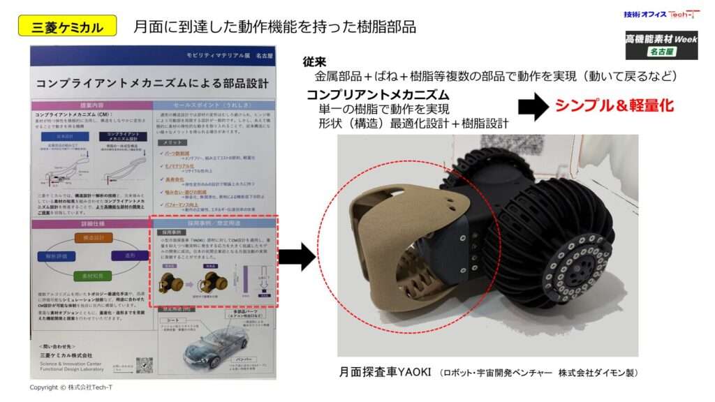 この技術により、部品点数削減、軽量化、メンテナンスフリー化、さらにはモノマテリアル化によるリサイクル性向上が可能となります。実際に月面探査車向け部品への適用事例も紹介されており、極限環境下での信頼性を確保しながら構造を簡素化できる点は、今後のモビリティ設計において重要な示唆を与えています。