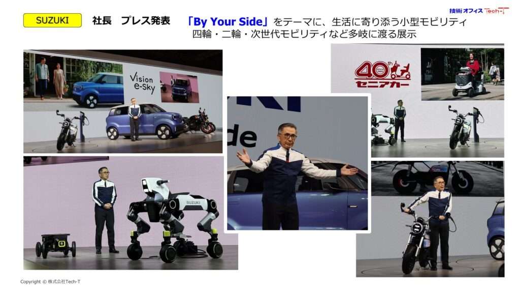 スズキは『By Your Side』をテーマに、生活に寄り添う小型モビリティを中心に、四輪・二輪・次世代モビリティを幅広いプレゼンでした。
