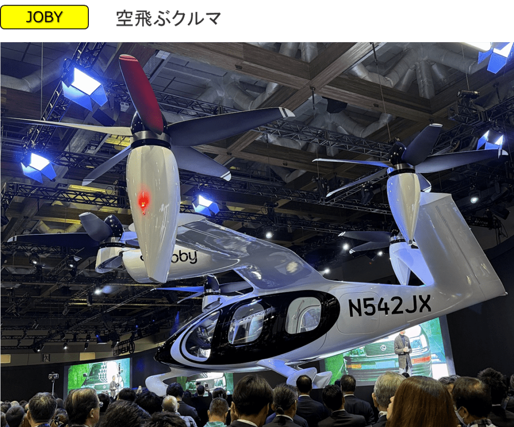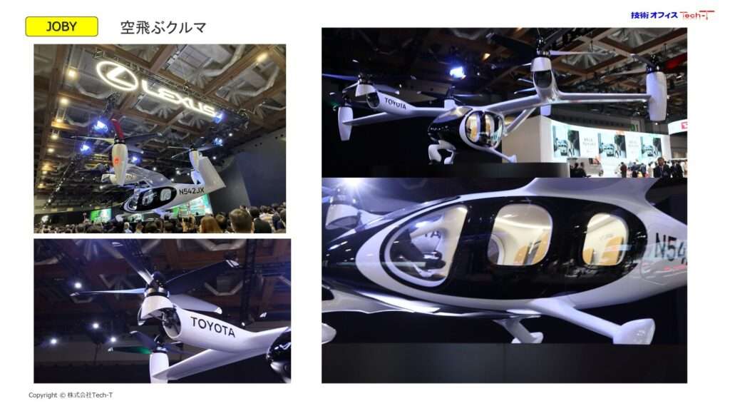 レクサスのすぐ横には、トヨタが出資しエンジニアも派遣しているJOBY AVIATIONのいわゆる「空飛ぶクルマ」が展示してありました。