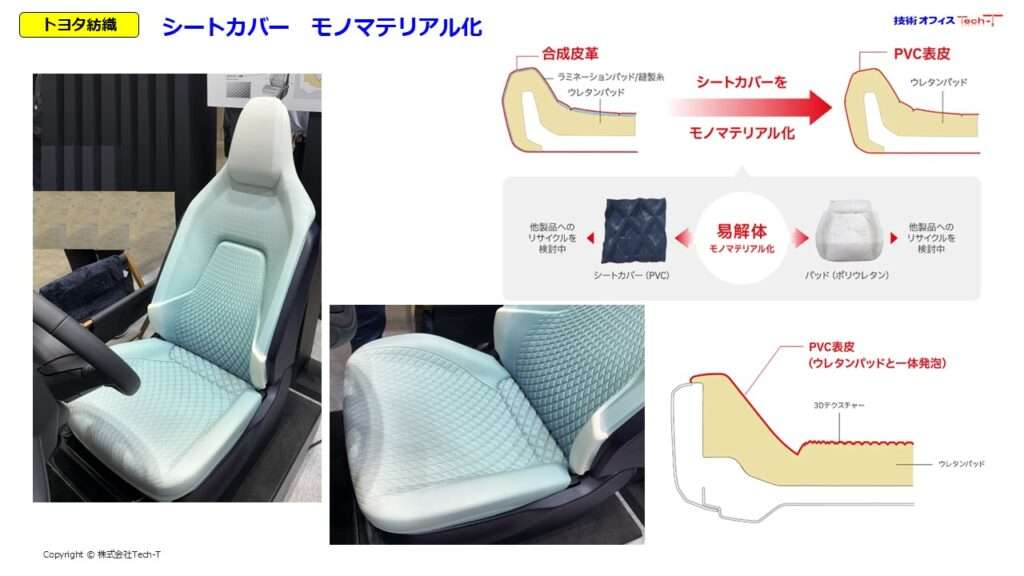 ドアトリムと同様に複数の材料で構成されているシートカバーの材料をPVC(塩化ビニール)に統一、モノマテリアル化シート表皮として展示されていました。