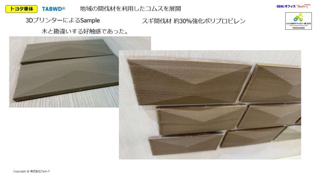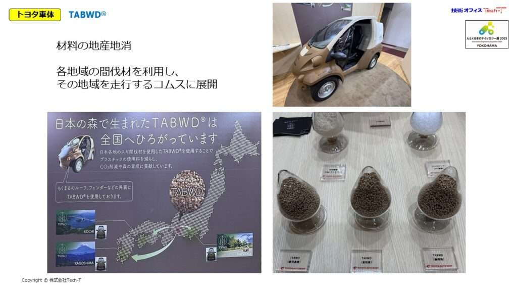このコムスの外板にTABWDを使用したコムス「もくまる」が展示されていました。(標準的な TABWDはスギ繊維30%、残りがポリプロピレン樹脂で構成)