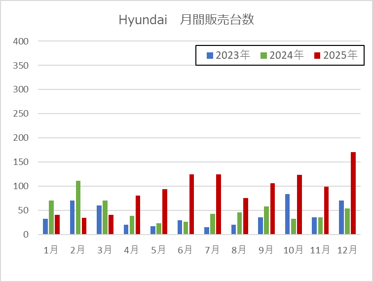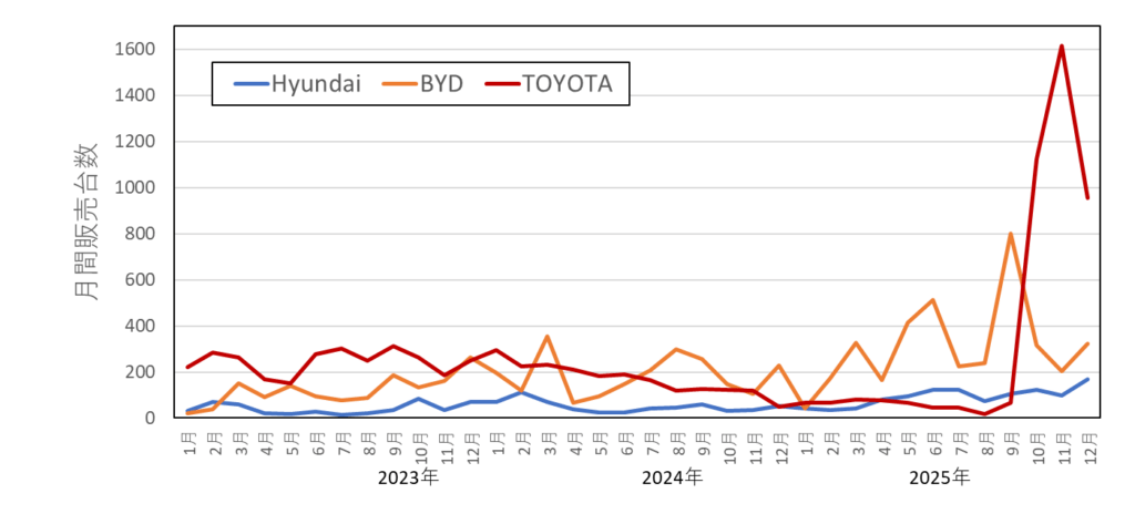 2025年11月までのデータがまとまりました。 Hyundai・BYDのこれまで、あるいは、他メーカーのBEV販売台数のレポートは以下からご参照ください。