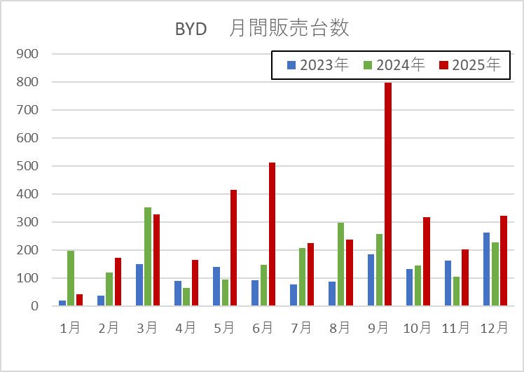 大幅値引き+補助金による価格競争力、モデルラインアップの拡充(ATTO 3・DOLPHIN・SEAL・SEALION)、ディーラー網と試乗体験の強化、安全性・デザインの訴求、販売ピーク期のキャンペーンといった要因が複合的に作用した結果です。10月以降急伸はありませんが増加傾向は続いています。