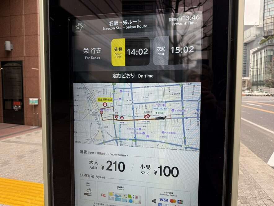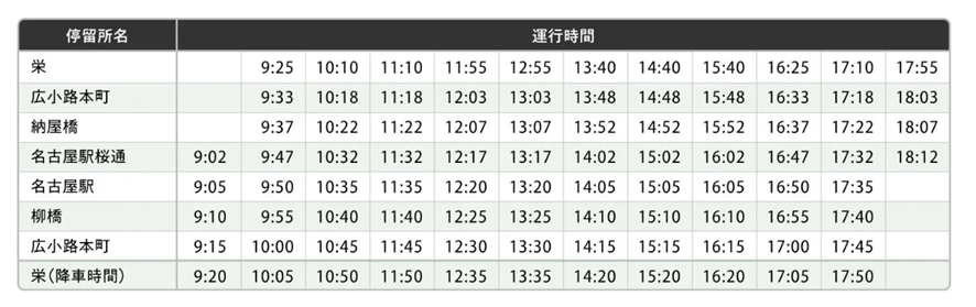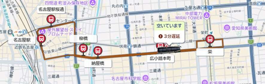 名古屋駅と栄の間の7か所の停留所をだいたい1時間に一本のペースで周回しています。