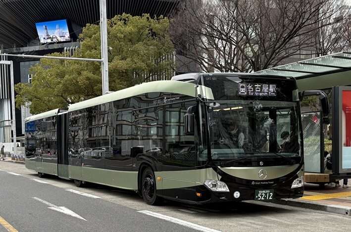 ドイツ製の連接バスで、栄と名古屋駅間、観光客の乗り歩き用の次世代型のモビリティです。